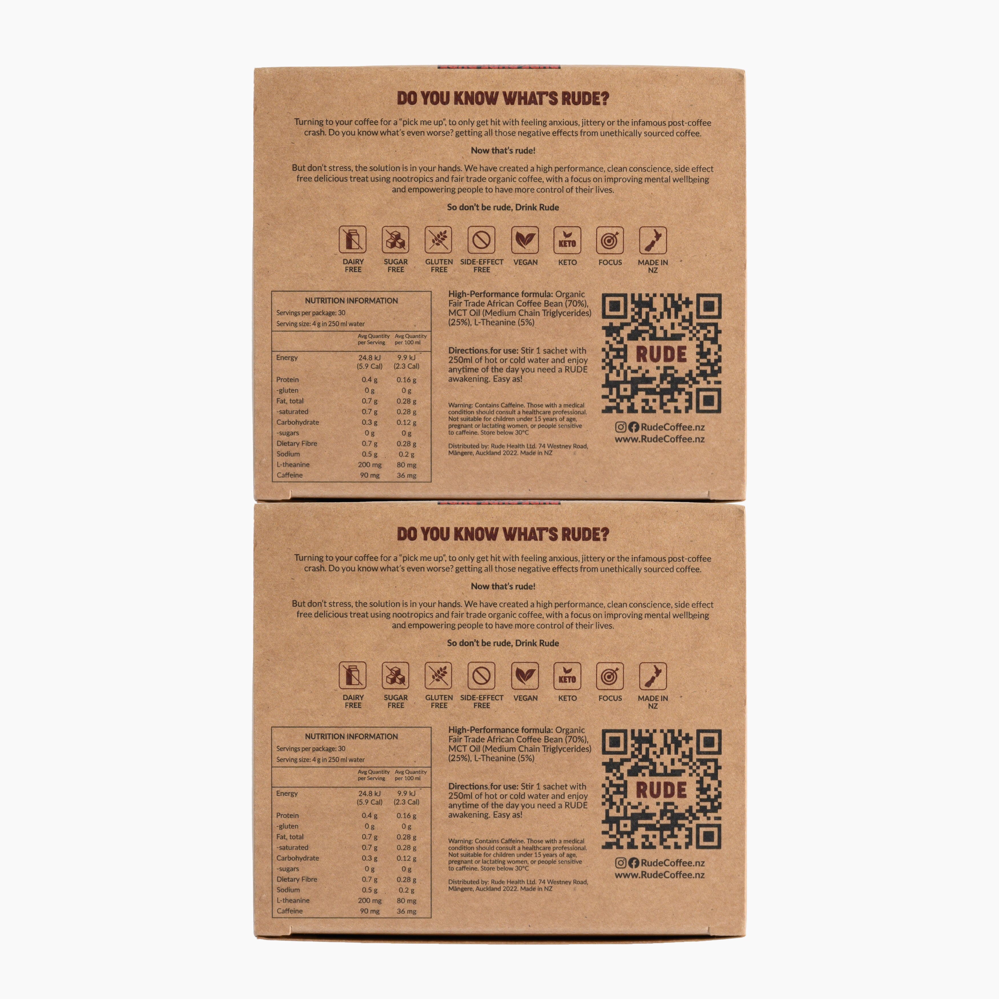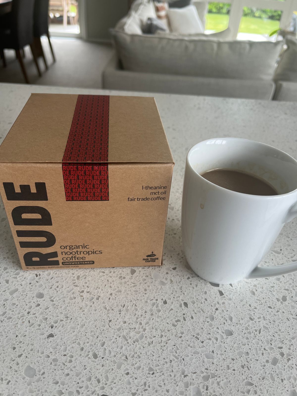 - RUDE Coffee has caffeine so it still provides the energy hit we love but the added nootropic ingredients reduce any negative side effects like anxiety, jitters, headache and energy crash. These nootropics also improve clarity and focus.