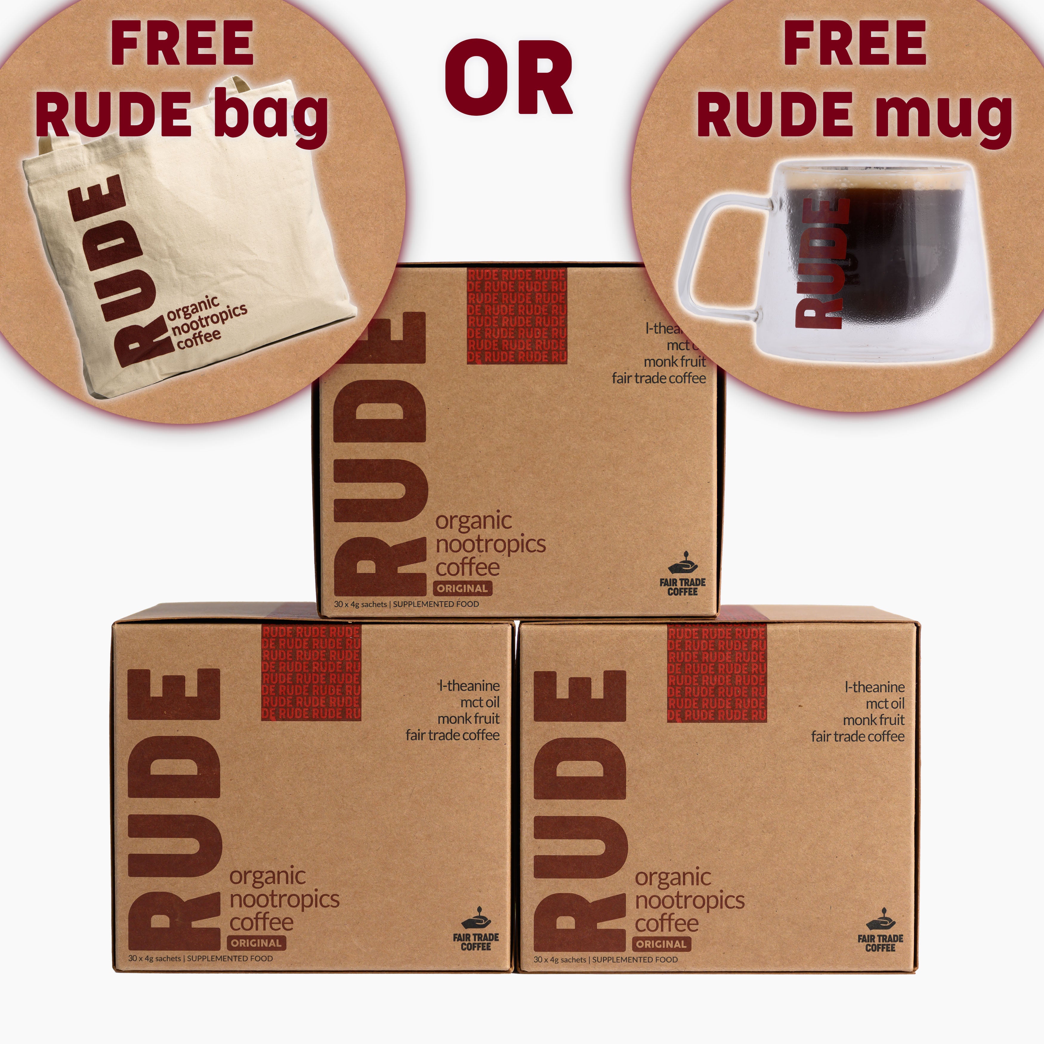 - RUDE Coffee has caffeine so it still provides the energy hit we love but the added nootropic ingredients reduce any negative side effects like anxiety, jitters, headache and energy crash. These nootropics also improve clarity and focus.