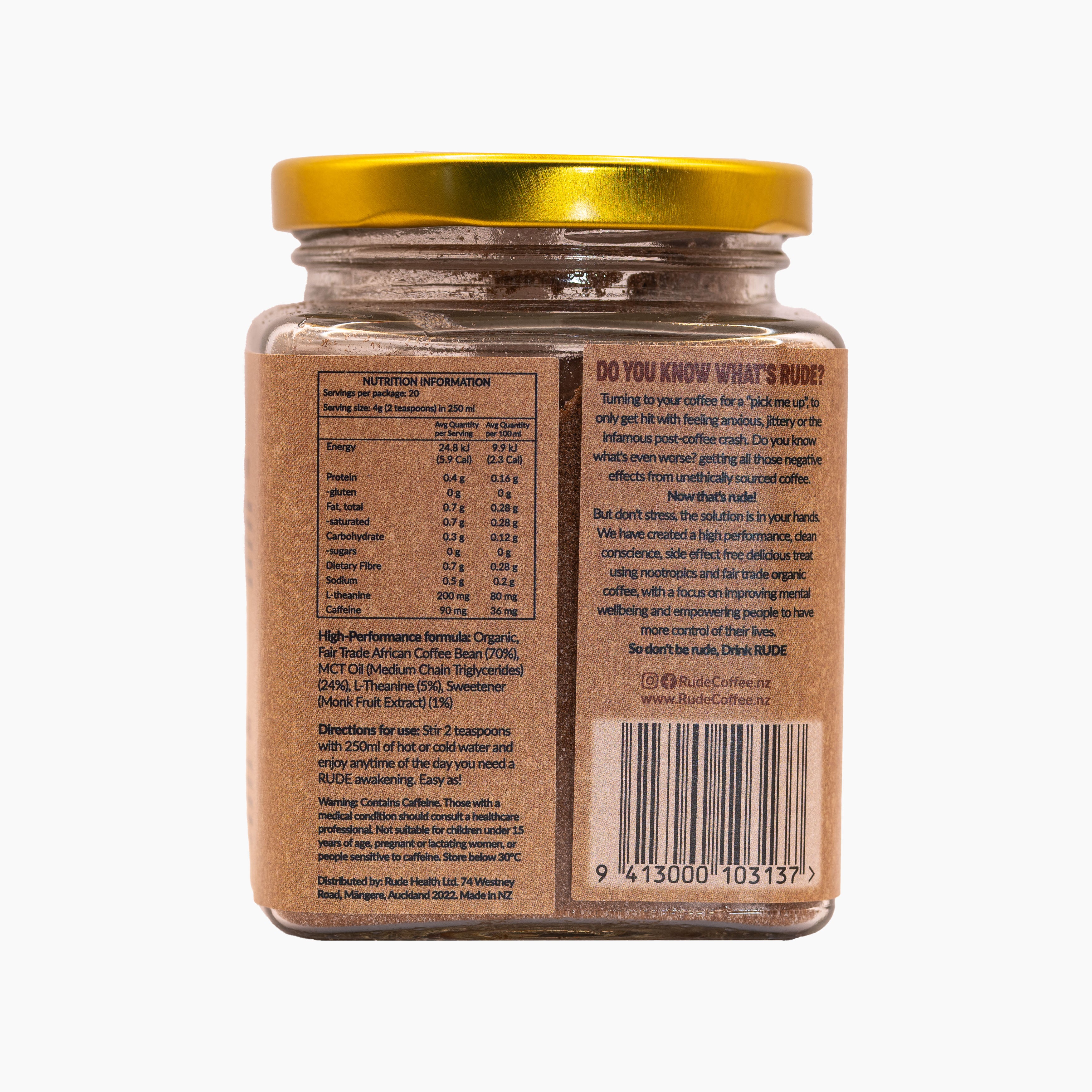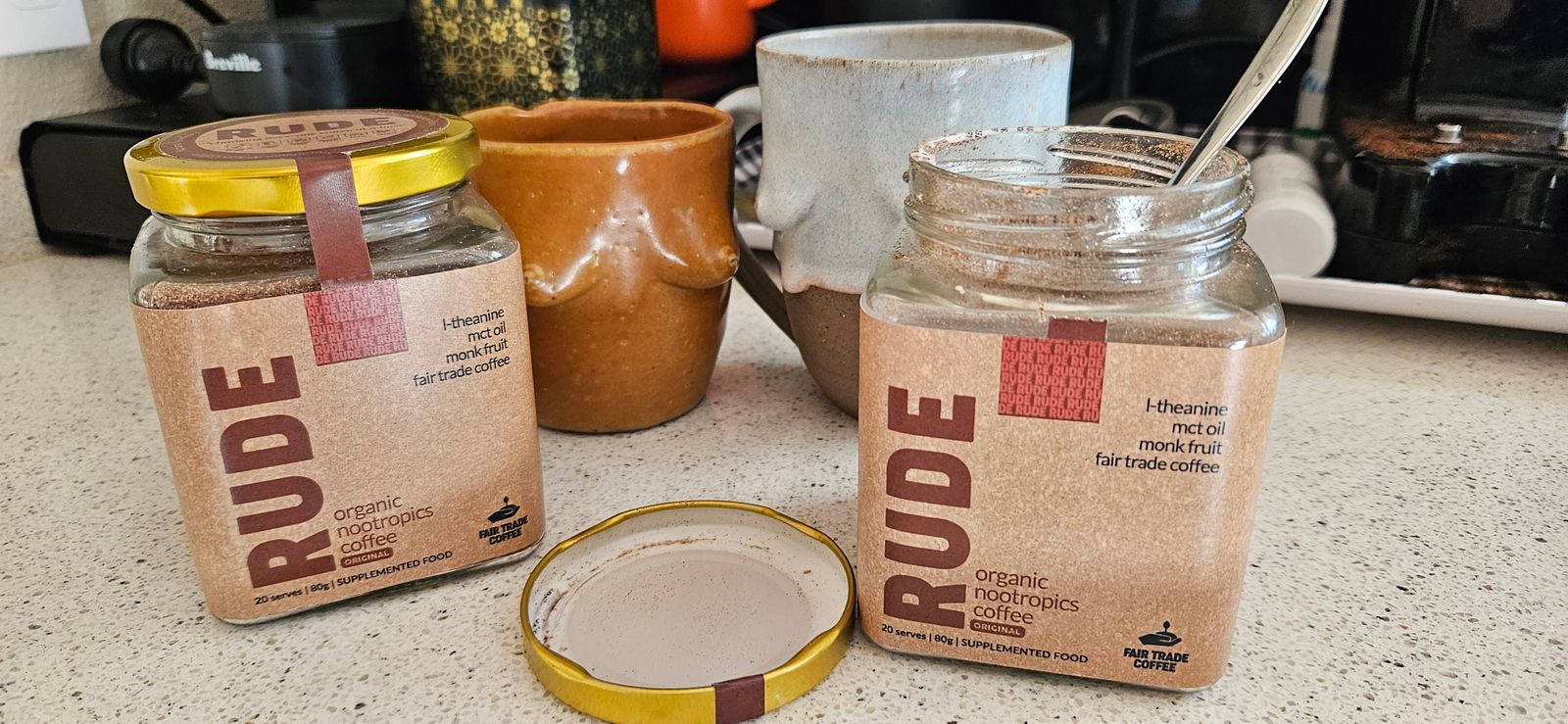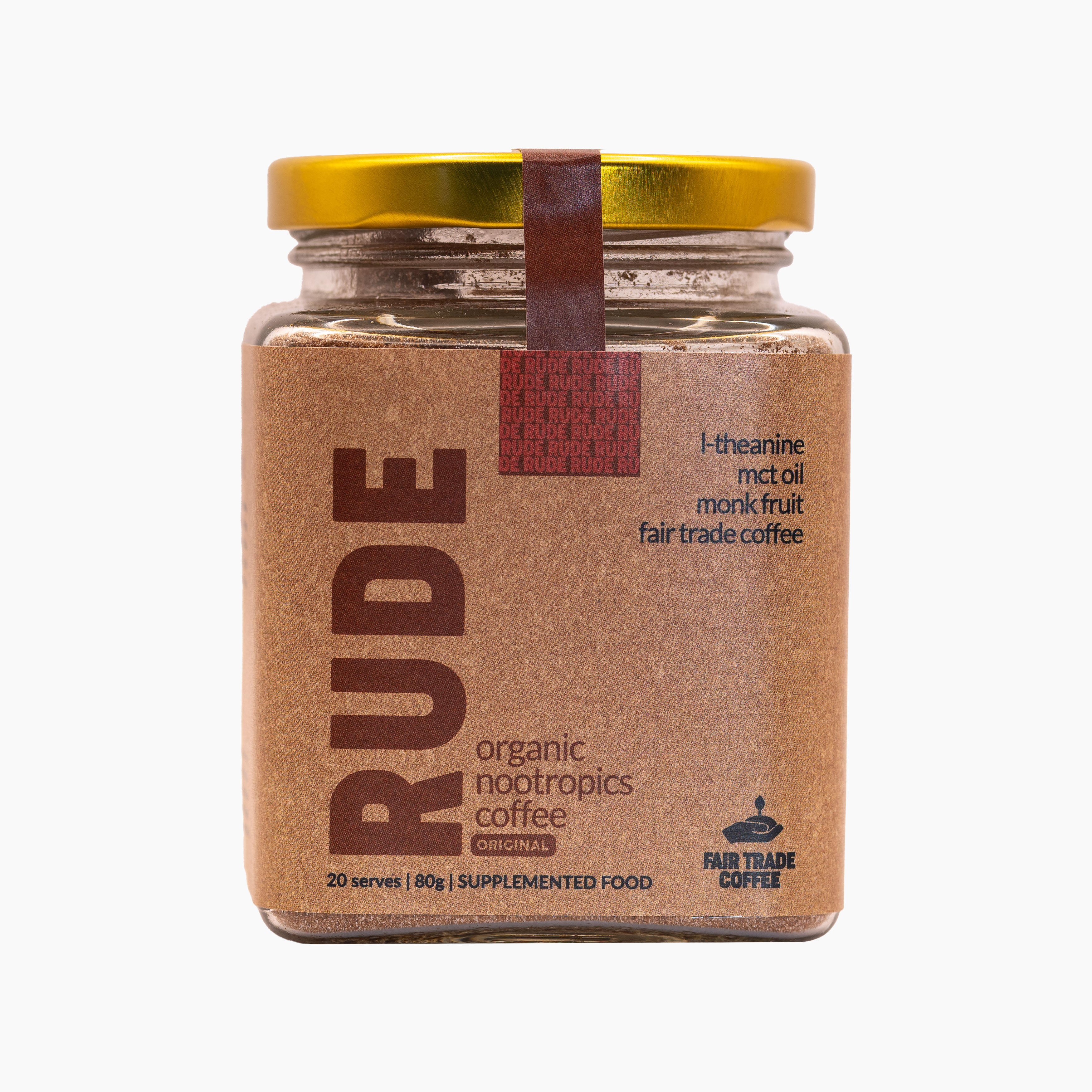 - RUDE Coffee has caffeine so it still provides the energy hit we love but the added nootropic ingredients reduce any negative side effects like anxiety, jitters, headache and energy crash. These nootropics also improve clarity and focus.